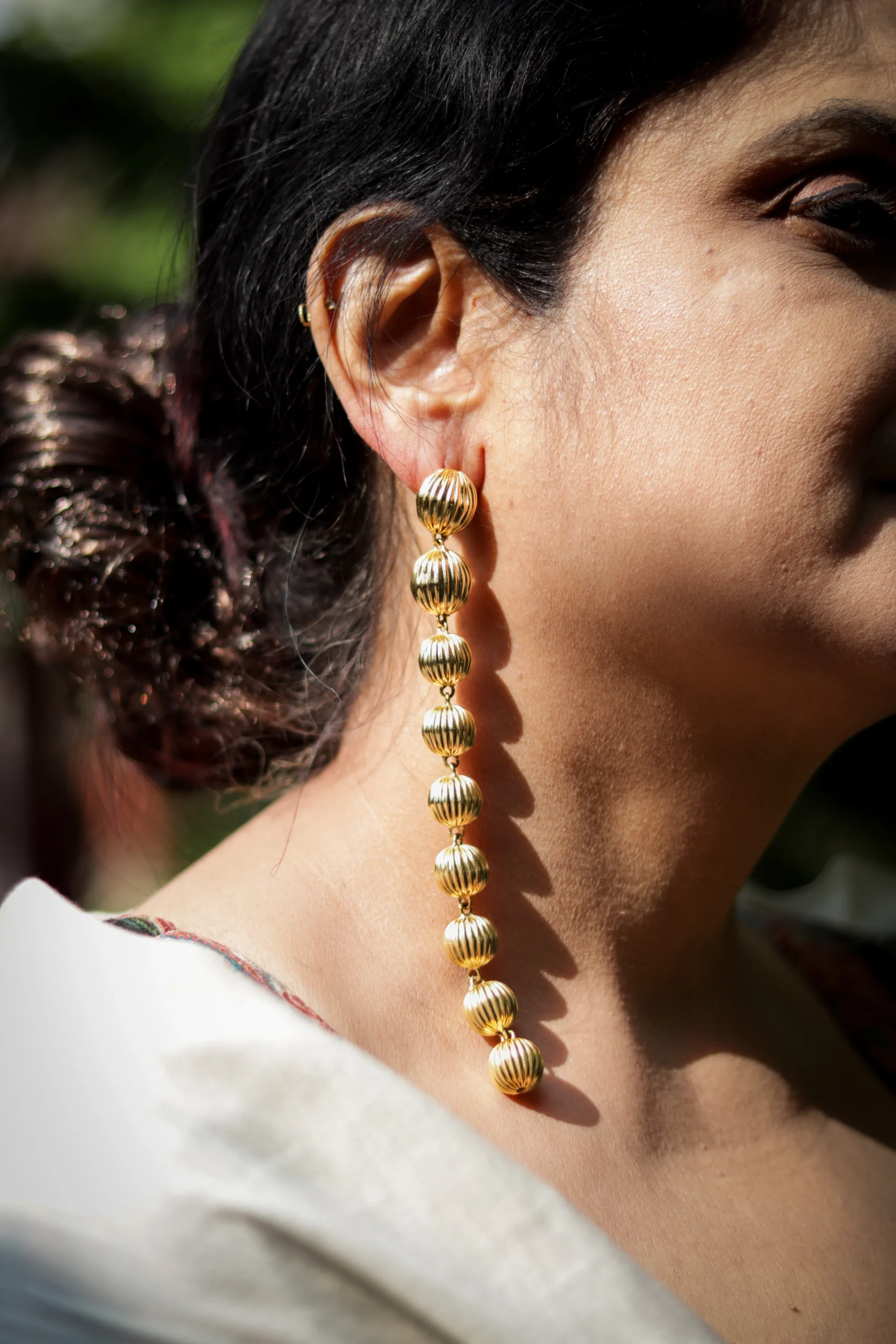 The Lambi Dori earrings are inspired by the humble dori that ties everything together, this design reimagines tradition in an ultra-modern silhouette. Crafted in brass and polished with 22kt gold plating, these sculptural domes cascade with effortless rhythm. They’re a quiet reminder that you don’t have to be loud to be unforgettable.