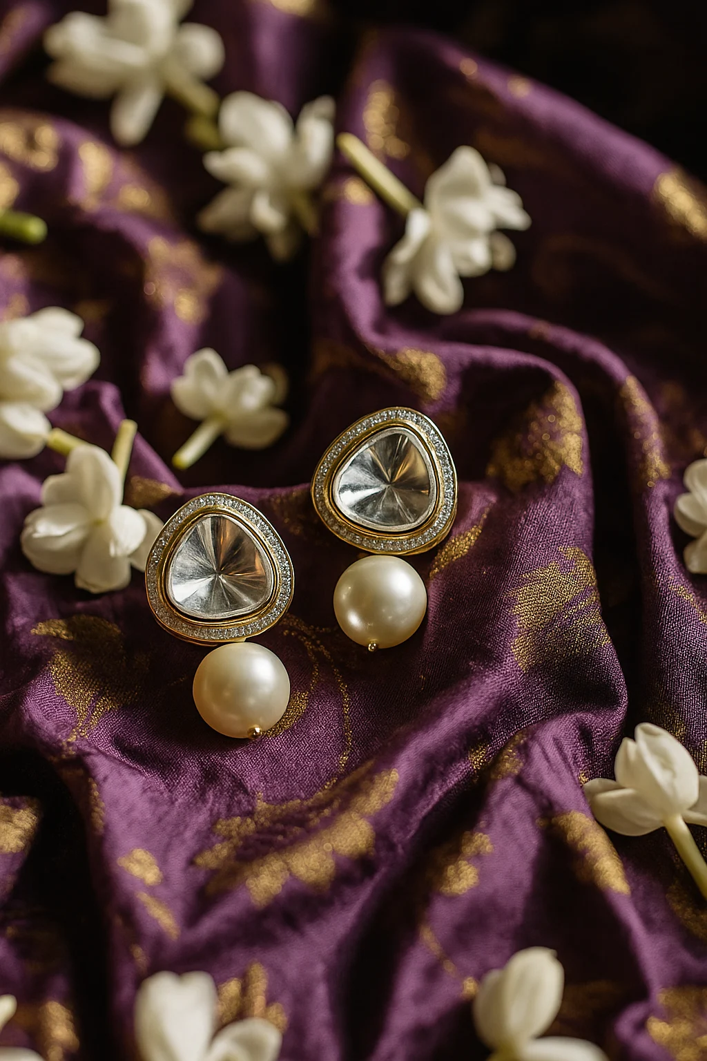 That mirror-finished polki-style centrepiece, edged with zirconia, and finished with that classic oversized pearl drop — it’s the kind of earring you reach for when you don’t know what to wear, but know you want to look expensive.